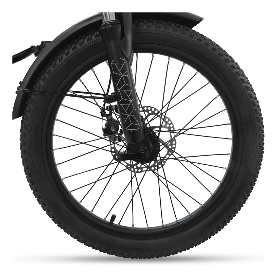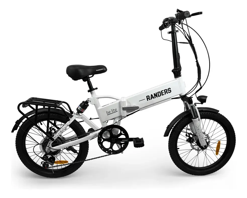 Bicicleta eléctrica plegable RANDERS 20 con motor 250W, batería de litio 37V 10,4Ah extraíble, cambios Shimano 7 velocidades, frenos a disco, doble suspensión y autonomía de hasta 50 km. Compacta, liviana y perfecta para movilidad urbana.
